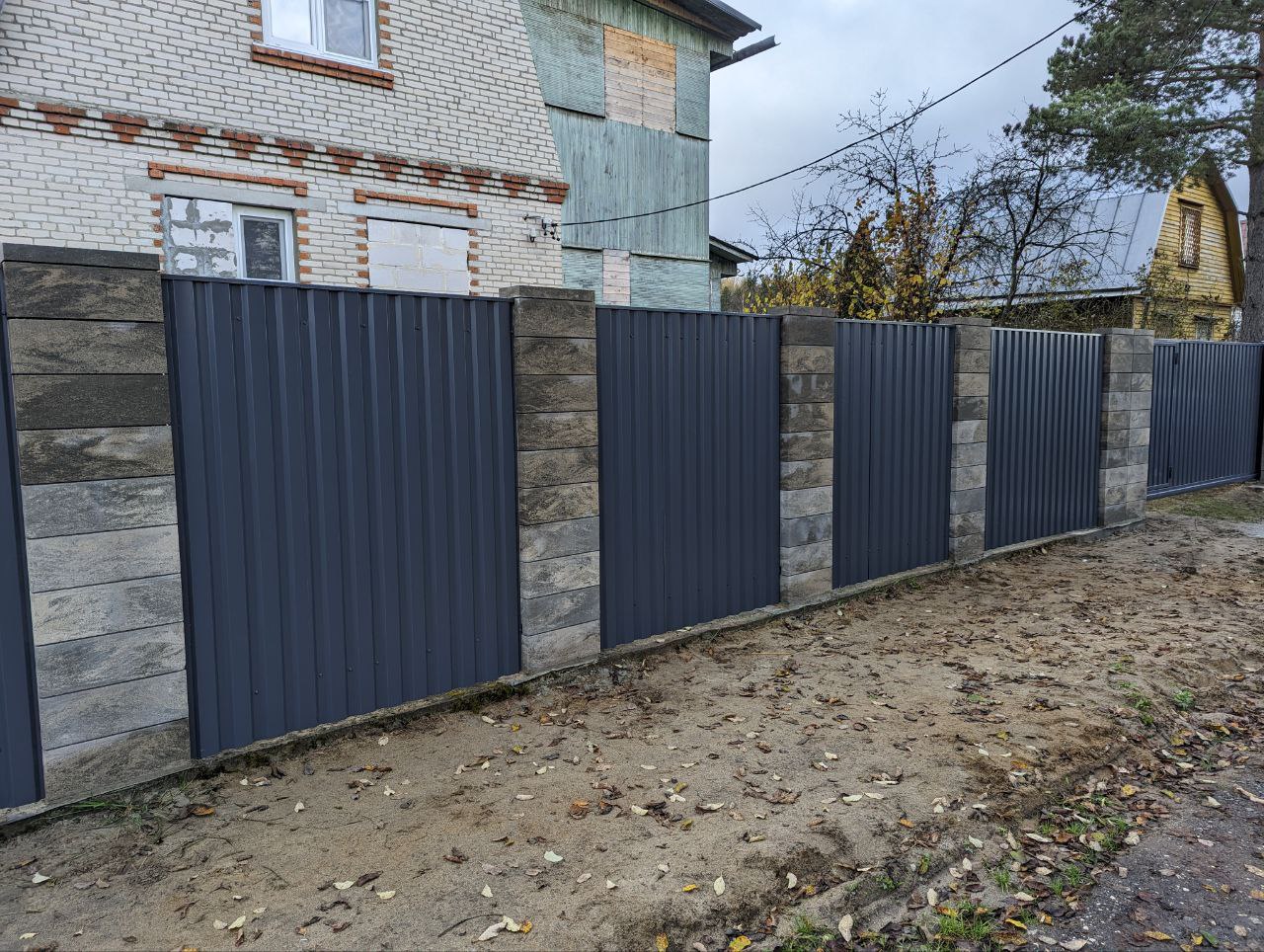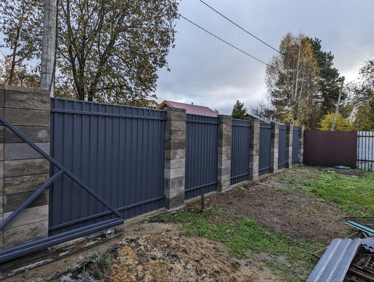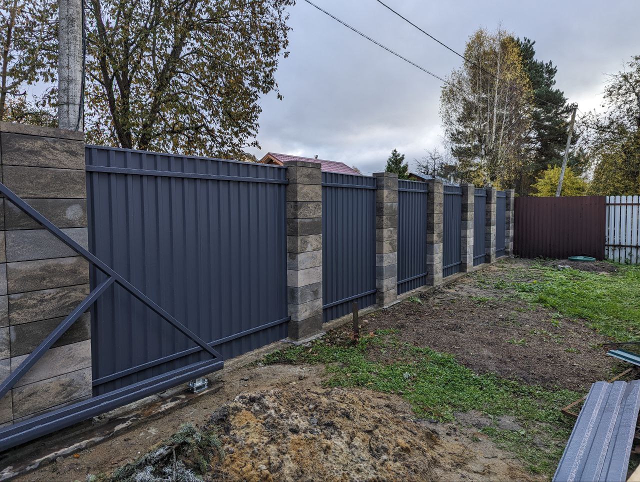 Забор из Блоков Gard с заполнением профнастилом. Откатные ворота со встроенной калиткой