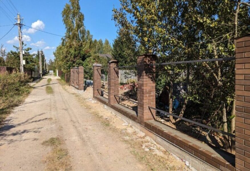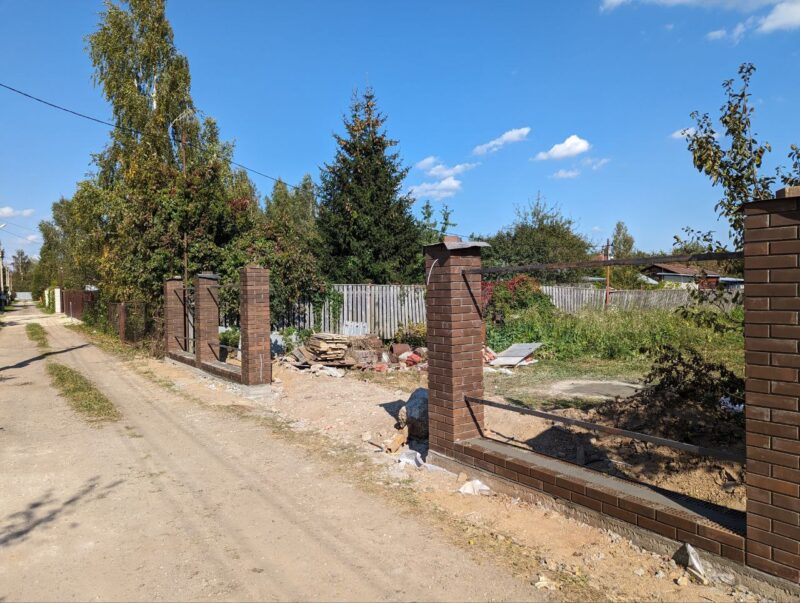 Забор установлен на бетонную ленту с кирпичными столбами. В комплекте с парапетами, автоматическими откатными воротами и калиткой с электромеханическим замком.