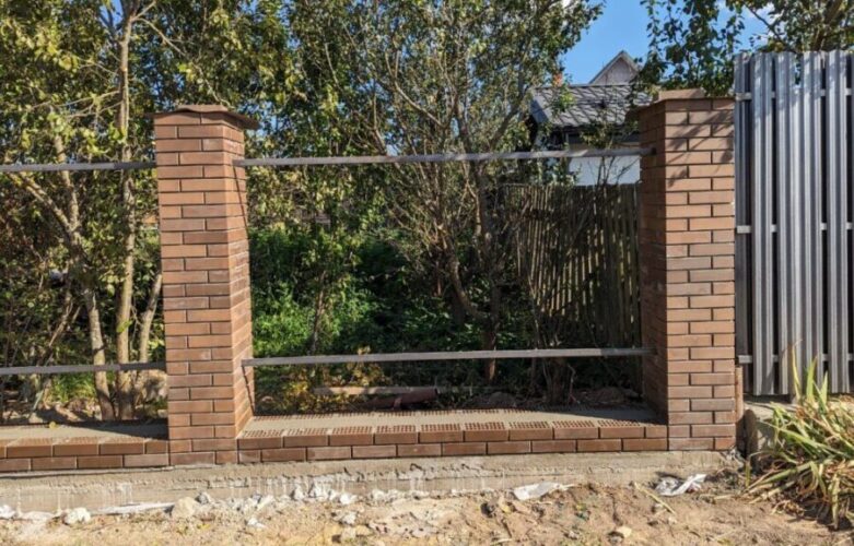 Забор установлен на бетонную ленту с монолитными столбами с дальнейшим оштукатуриванием и покраской. Установлены металлические парапеты и колпаки.
